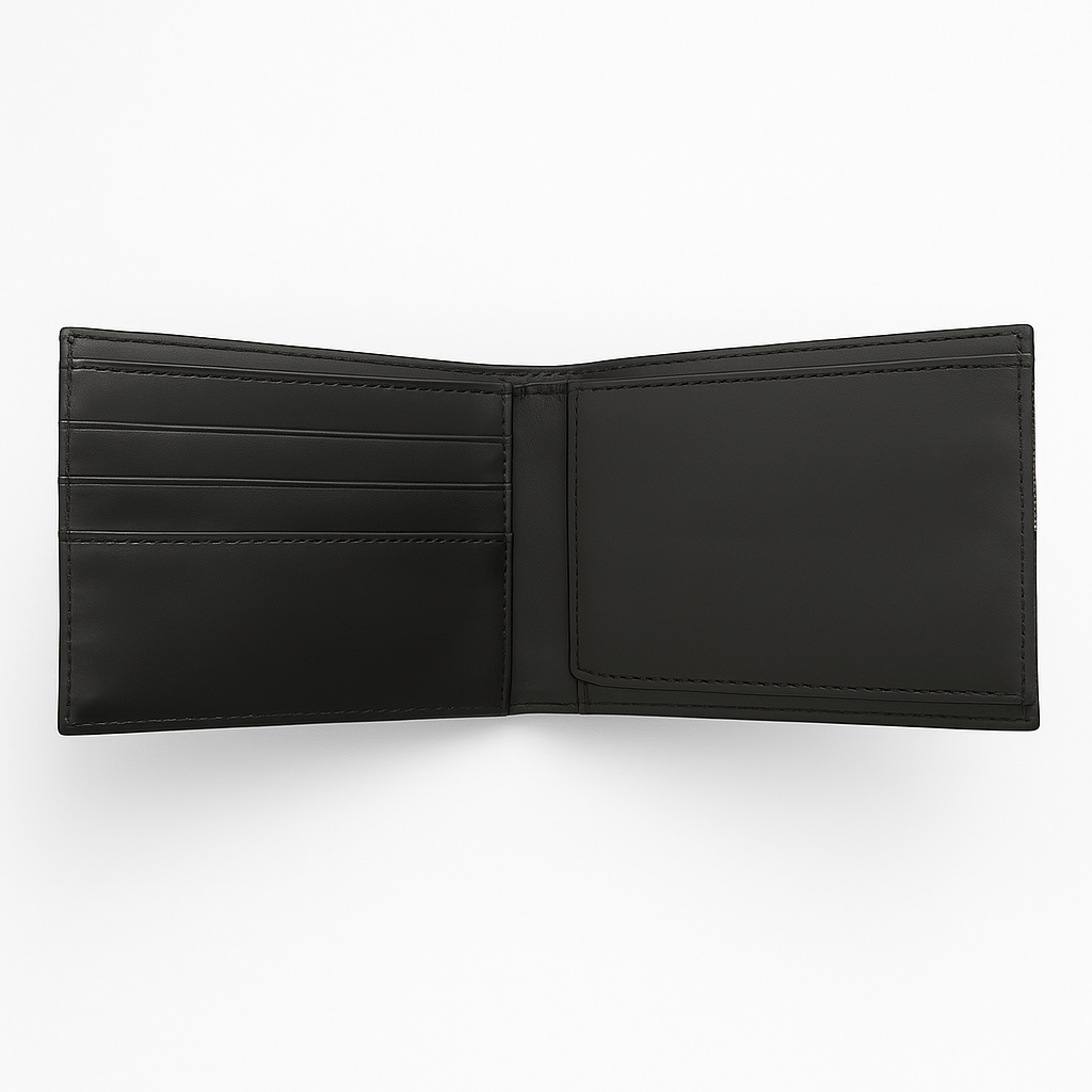 Esta billetera está confeccionada en cuero genuino negro con costuras blancas contrastantes, que realzan su diseño moderno y sofisticado.