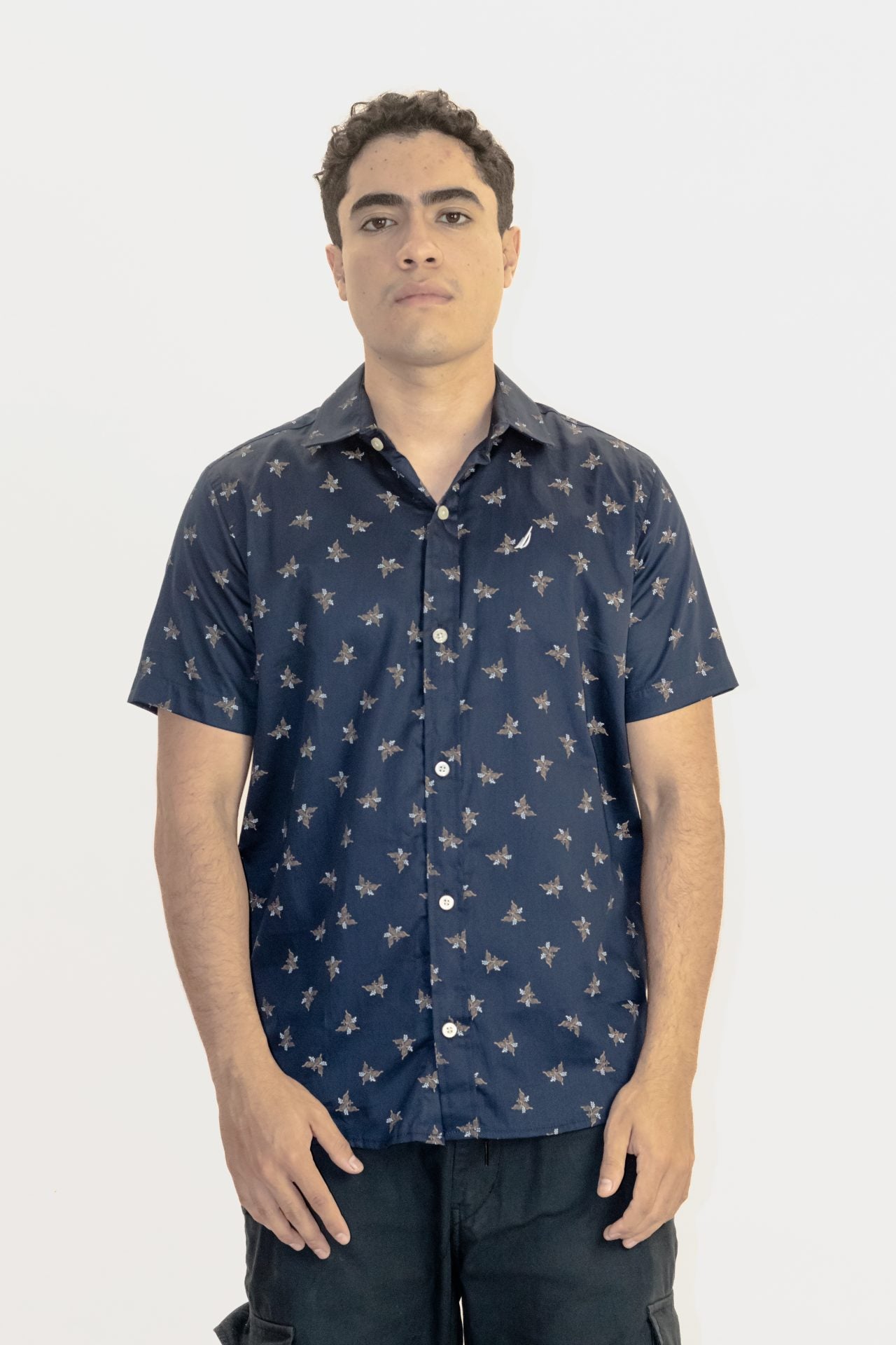 👔 Camisa manga corta azul marino con detalles tipo mosaico floral, confeccionada en tela popelina ligera y resistente 🌿 que ofrece frescura, suavidad y confort en todo momento. Su estampado sutil en tonos beige y dorado aporta un toque moderno sin perder elegancia 💎. Con corte clásico y botones frontales, es perfecta para un look casual sofisticado o una salida de noche con estilo. ✨ Combina fácilmente con jeans o pantalones claros. 🔥 ¡Un básico moderno que eleva tu outfit al instante! 🛍️