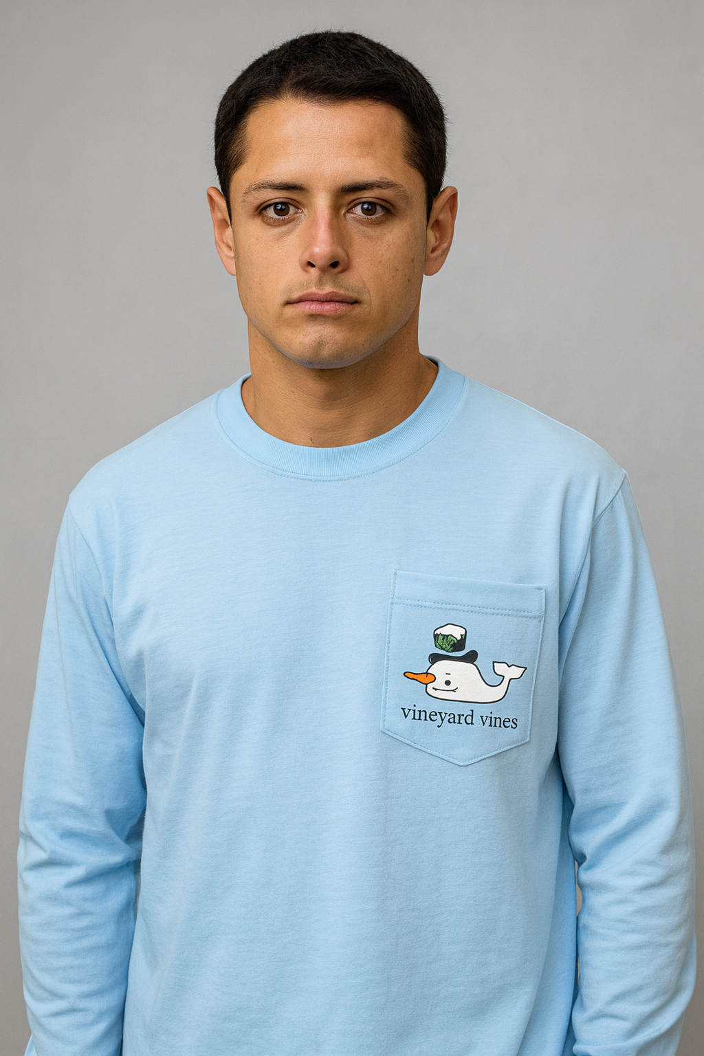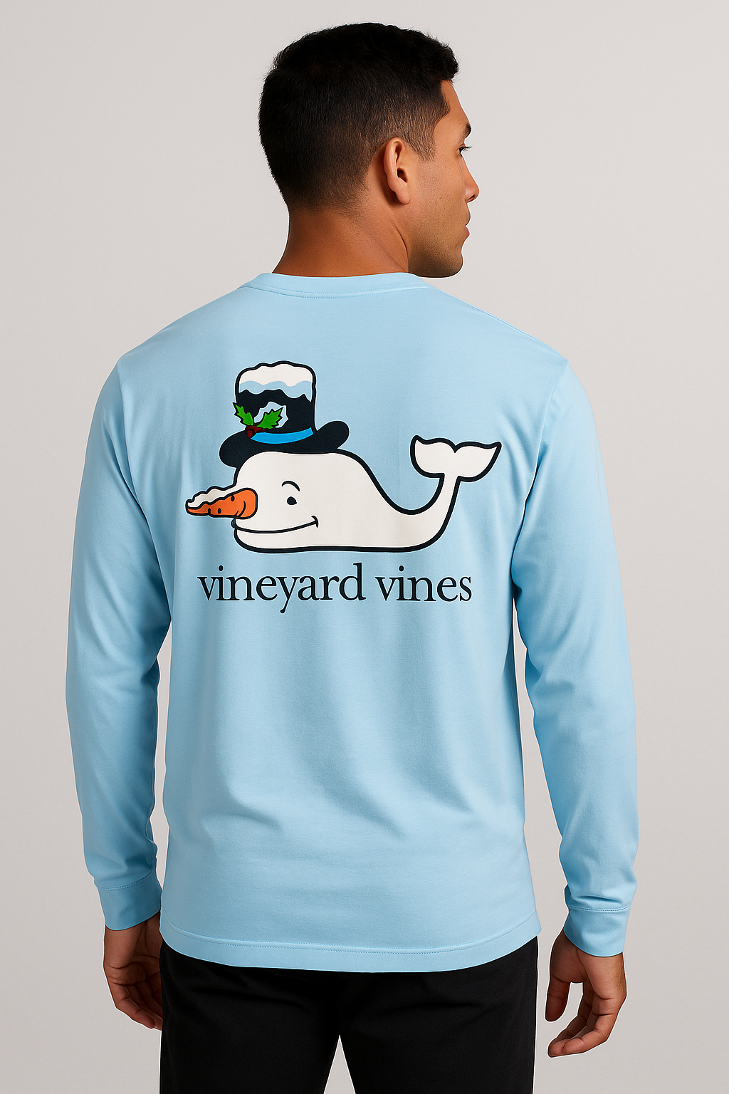 ❄️👕 Manga larga Vineyard Vines celeste edición Muñeco de Nieve, hecha en algodón pima premium que brinda suavidad extrema, frescura y comodidad durante todo tu día 🌬️✨; diseño especial con bolsillo frontal y la icónica ballena convertida en un muñeco de nieve con sombrero navideño, detalles nítidos y colores vibrantes que destacan al instante ⛄🐋💙; ideal para un look moderno, limpio y festivo, perfecta para combinar con jeans o joggers y lucir con estilo en cualquier ocasión 🔥🙌🎄