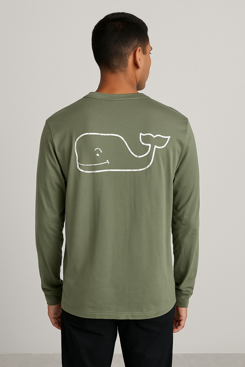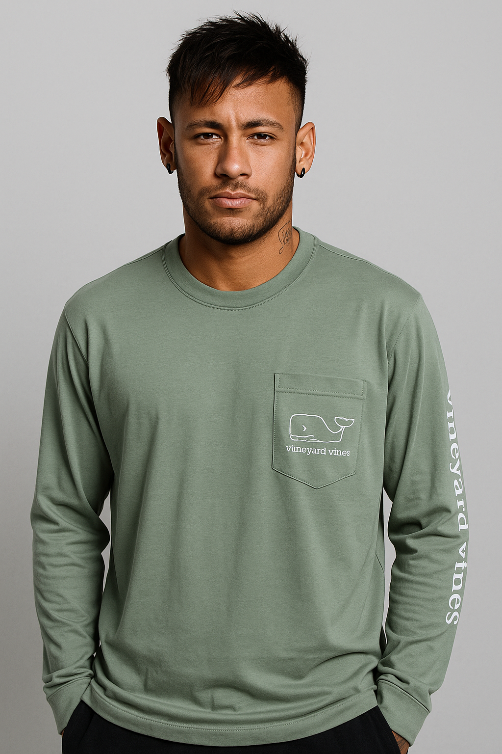 💚👕 Manga larga Vineyard Vines verde oliva suave, confeccionada en algodón pima premium que ofrece suavidad total, frescura y comodidad durante todo el día 🌿🌬️✨; diseño limpio con bolsillo frontal y la icónica ballena en estampado fino, acompañado del texto lateral vineyard vines que aporta un estilo moderno y relajado 🐋💯; ideal para un look casual, minimalista y elegante, fácil de combinar con jeans, joggers o cargo para un outfit fresco y con actitud 🔥🙌