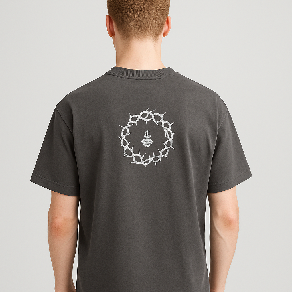 Un diseño imponente y con significado 🙌🏼. Este polo color plomo oscuro destaca por su gráfico central de la Corona de Cristo, símbolo de fuerza, fe y resistencia 🕊️. Su corte BoxyFit brinda una caída libre y moderna que aporta estilo y comodidad 🔥. Fabricado con algodón grueso premium, ideal para un look urbano con actitud y propósito 💪🏽🖤. Perfecto para quienes buscan vestir diferente, con esencia y carácter