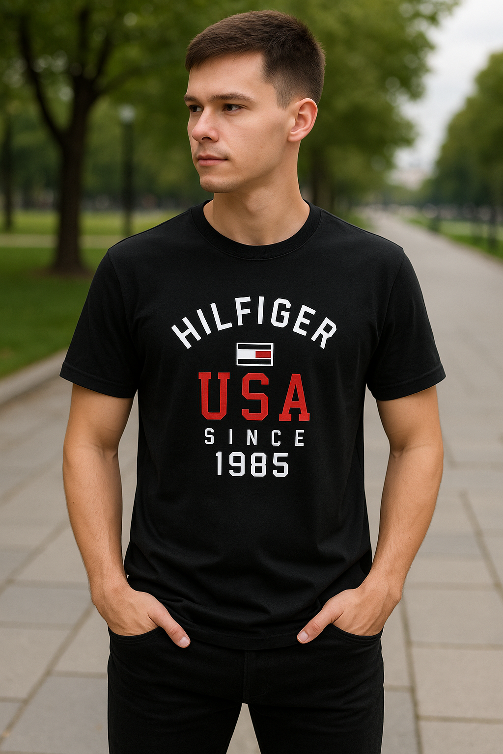 Estilo clásico con actitud moderna 💪✨. Fabricado en algodón suave premium 👕, ofrece comodidad y frescura todo el día 😎. Su diseño negro con el logo Hilfiger USA 1985 resalta un look auténtico y versátil 👌. Perfecto para combinar con jeans o joggers 👖 y lucir impecable en cualquier ocasión 💥🔥.
